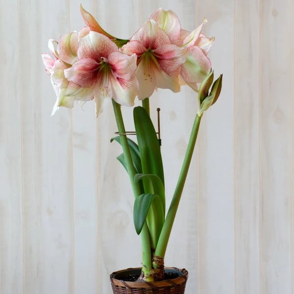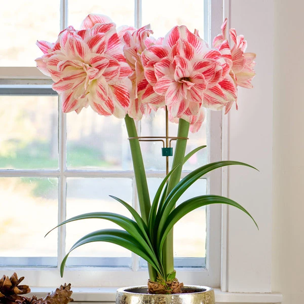 Many of our Amaryllis, especially the doubles, produce blooms so large and heavy that their stems occasionally have difficulty holding them aloft, so we support our plants with our Antique Gold Amaryllis Stake. Made of plastic-coated, galvanized-steel that’s finished in antique gold, each has a loop that slides along the stake to the desired height and unhooks to enclose a leaning stem. You’ll find these functional and decorative stakes handy for other houseplants, too. In summer, they perform equally well in the garden. The stake comes in 2 pieces that screw together easily and quickly, 21″ tall.