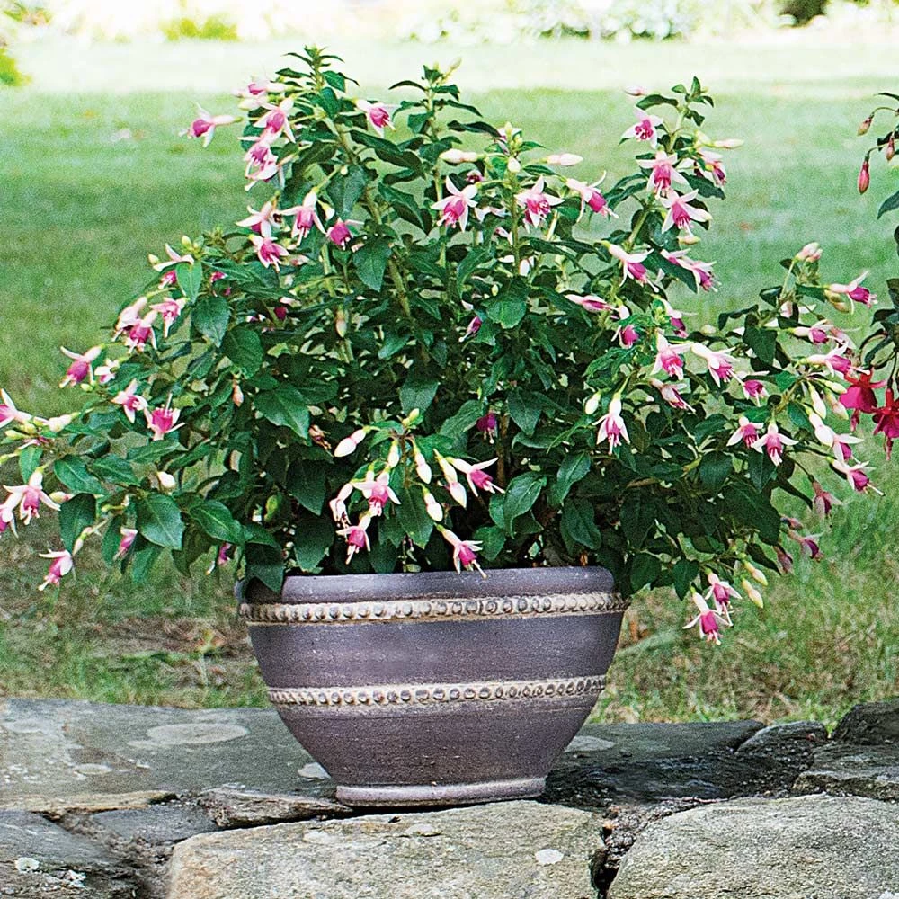 This exceptional handmade Barnsley Bowl pot is detailed with 2 bands of pearl-like patterning and makes a stately home for our winter-blooming Jasmine plants. Come summer, it’s equally handsome filled with other mounding plants such as Coleus and Begonias. Measures 10″ wide by 6″ high. One drainage hole.