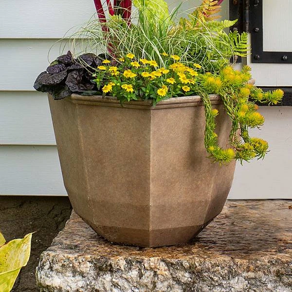 The classically structured, octagonal Casablanca Pot is perfectly sized for a wide variety of plantings. The cement-colored, lightweight, resin vessel has eight uniform segments, each defined by a strong vertical edge that is especially welcome in contrast to soft, unstructured mounding plants such as Impatiens and Begonias. But the Casablanca also makes a fine host to more formal plants or plant groupings that mirror its structured form. Fill it with one of our Topiary Patio plants or a spiky Cordyline. The container’s slightly narrower beveled base and banded rim complete a timeless design.