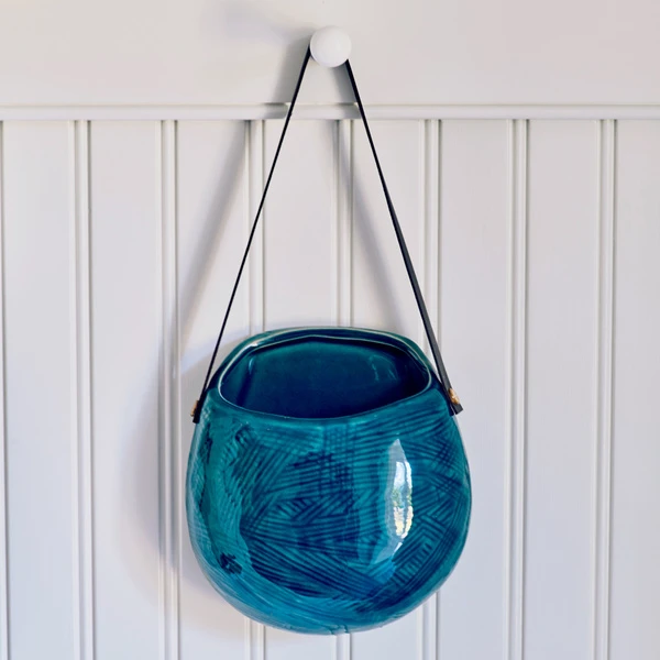 Take gardening to a new level with our Ceramic Pocket Planter in a sumptuous shade of teal blue. Cachepot and contents will hang securely from the attached leather strap. Add a touch of freshness and living color to an otherwise plain wall, or try suspending the vessel over a door (using a simple wreath hook) for a cheerful welcome. The uses are limited only by your imagination. Insert a miniature Orchid or small houseplant with its preferred growing medium, or display a festive floral arrangement, fresh or dried. Can also serve as a catchall for odds-and-ends like writing utensils, recipes, or letters for posting. Flowers not included.