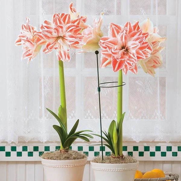 Many of our Amaryllis, especially the doubles, produce blooms so large and so heavy that their stems occasionally have difficulty holding them aloft, so we support our plants with our Dark Green Amaryllis Stake. Made of plastic-coated, galvanized-steel that’s finished in dark green, each has a loop that slides along the stake to the desired height and unhooks to enclose a leaning stem. You’ll find these functional and decorative stakes handy for other houseplants, too. In summer, the stakes perform equally well in the garden. The stake comes in 2 pieces that screw together easily and quickly, 21″ tall.