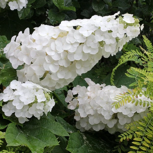 Hydrangea quercifolia Gatsby Gal®, a flamboyant beauty boasts massive flower heads, boldly sculpted leaves with brilliant fall color, and handsome peeling bark. Selected from a breeding program designed to produce interesting flower forms, these remarkably full blossoms open creamy white, and turn to rosy pink in fall. Plants are relatively compact, and create an impressive show all season long. A Proven Winners® variety. ‘Brenhill’ PP 25,106