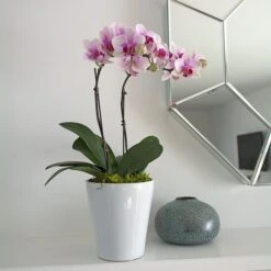 Our Let It Snow Dish Garden features the snowy white flowers and frosted leaves of Cyclamen Halios® Pure White which glimmer above the festive red bracts of a compact red Poinsettia. Adding feathery green are the fronds of two Ferns. We ship 4 potted plants to arrange in a ceramic bowl with a coppery metallic finish.