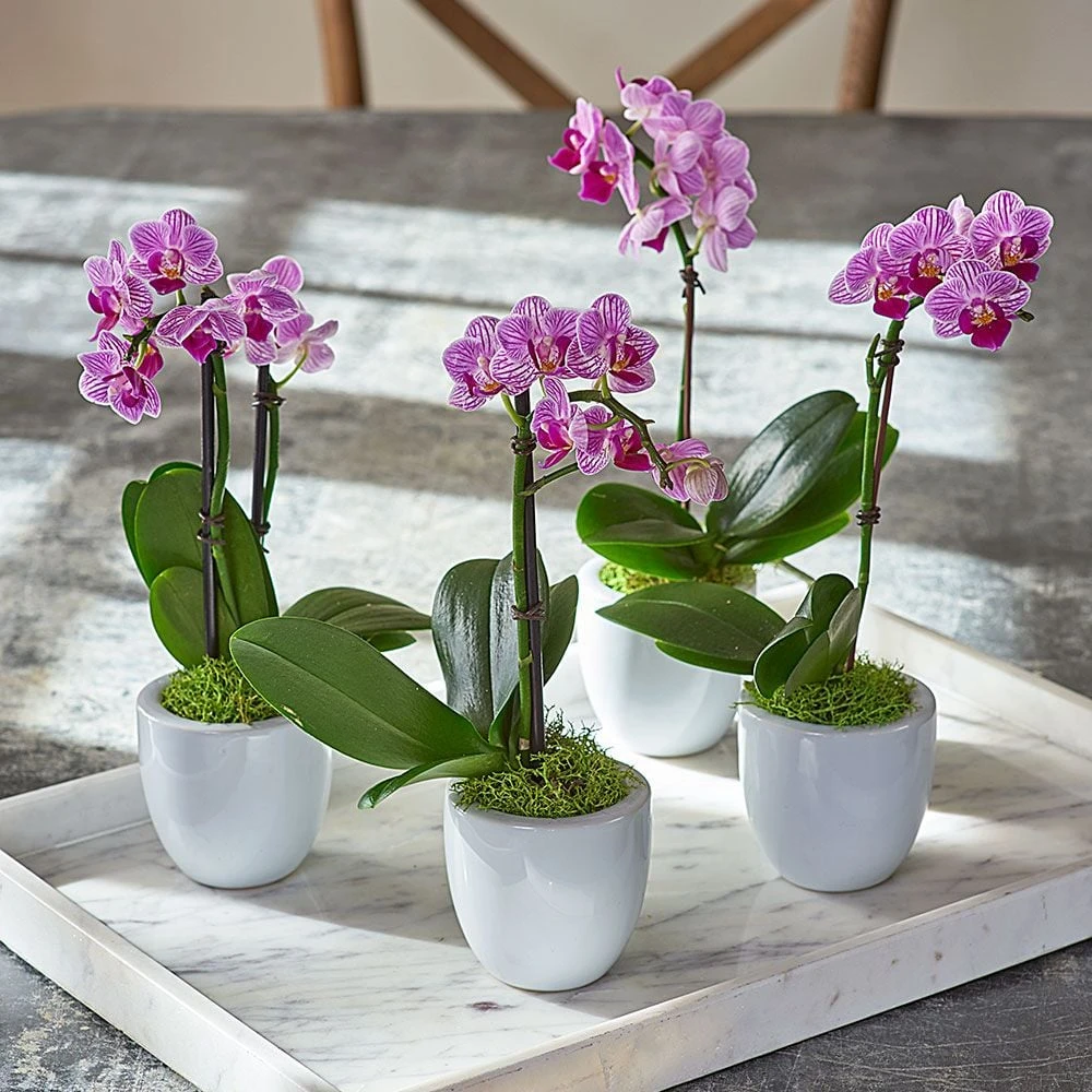 Create instant dinner party magic when you set a table with this darling Mini Orchid Quartet in 3″ white ceramic cachepots. Each purple-and-white flowering Phalaenopsis arrives nested in a white ceramic pot that resembles an eggcup. The low-maintenance plants arrive fully budded, and the flowers open in sequence to provide an extended color show. Our minis make terrific party favors, and theyโre great for gifting, too. Set of four.ย