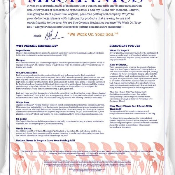 Give your container plants the advantage of nutritious, well-draining soil. Our all-purpose, organic blend is ideal for growing annuals, repotting plants, and filling containers large and small, including those that house herbs, perennials, and woody plants. The OMRI-listed mix contains compost, Pine bark, coir, worm castings, and rice hulls.