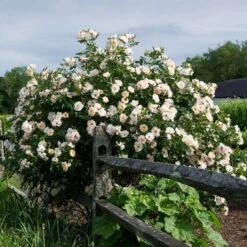 If you live in a colder climate where Roses sometimes struggle in the spring season, Above and Beyond™ is for you! This stalwart Rose has thrived for us after many harsh Connecticut winters, suffering no dieback and blooming right on schedule each year. Clusters of orange buds open to large, pale apricot blossoms that envelop this vigorous, cold-hardy climber. The 3″ semidouble to double flowers arrive in spring or summer followed by intermittent bloom later in the season. Medium to light green foliage provides harmonious counterpoint. Mild to no fragrance. Own-root. ‘ZLEEltonStrack’ PP 24,463