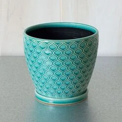 Add instant style to your interiors with this decorative ceramic cachepot. Glazed in a rich, deeply saturated turquoise, the pot is then geometrically patterned in a timeless design suggestive of Moroccan tile motifs. This pot elevates the look of any houseplant. It’s great for gifting, too.