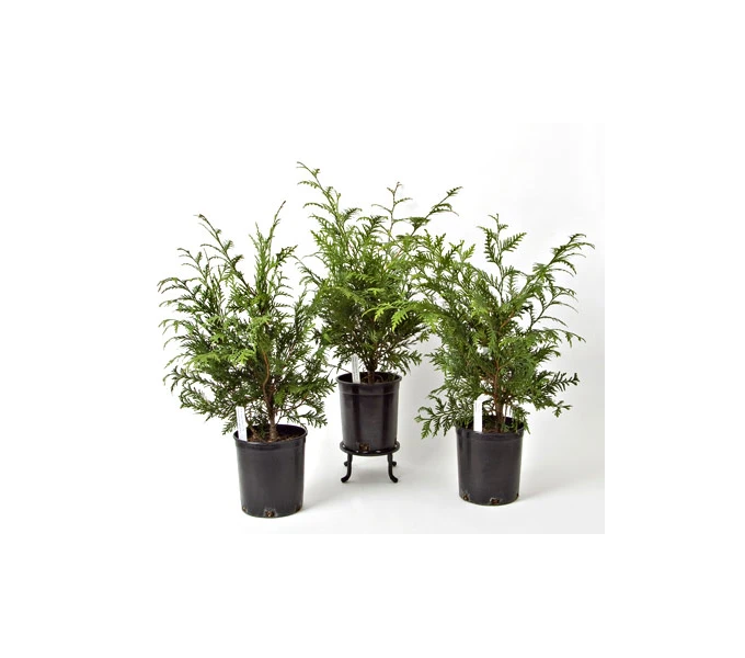 Although a small genus of six evergreen Conifers native to North America and East Asia, Thuja is important as a source of timber and ornamental trees and shrubs. You might know the weather-resistant wood of White Cedar (Thuja occidentalis) and Western Red Cedar (T. plicata) as the material of choice for fence posts, shingles, greenhouses, and other outdoor structures. A great number of varieties are available, selected for unusual form, color, texture, or growth rate, and are useful as specimen trees or in hedges, or in the case of dwarf forms, in rock gardens and foundation plantings. Grow in average to moist, well-drained soil.