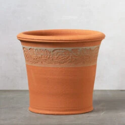 A motif of Poppy blossoms, created by hand by the artisans at England’s Whichford Pottery and rendered in a broad band of ash-grey slip, comes close to suggesting the intricacy of lacework on a versatile clay pot that is sized to accommodate a variety of plants – from fresh herbs and Begonias to Ferns and forced bulbs. The vessel’s classic design also features a well-defined rim, which makes for easy handling, and a subtle widening to form the base, which is finished with a discreet band detail. The pot is ornate enough to be used inside the house and superb for outdoors, too.